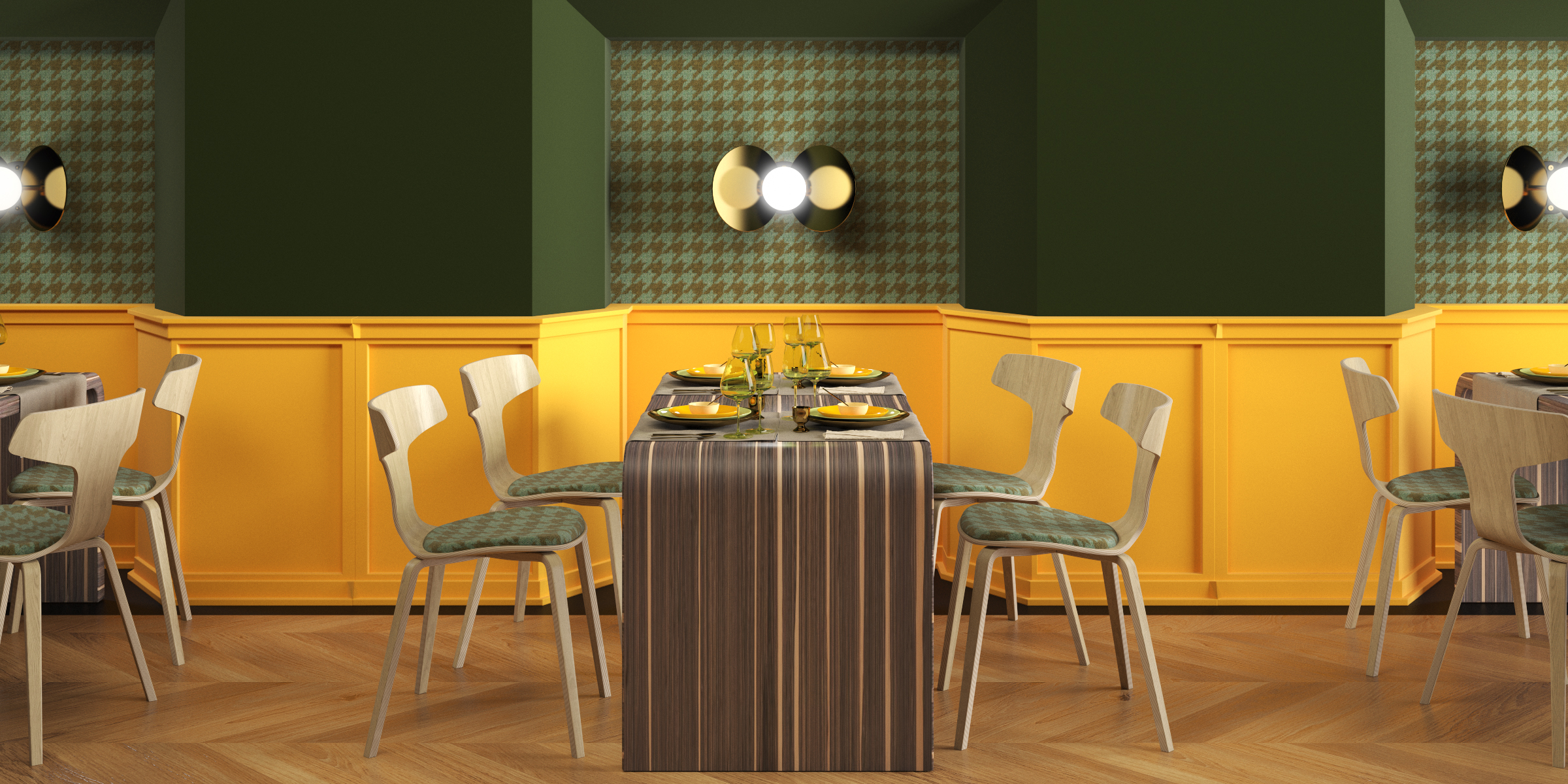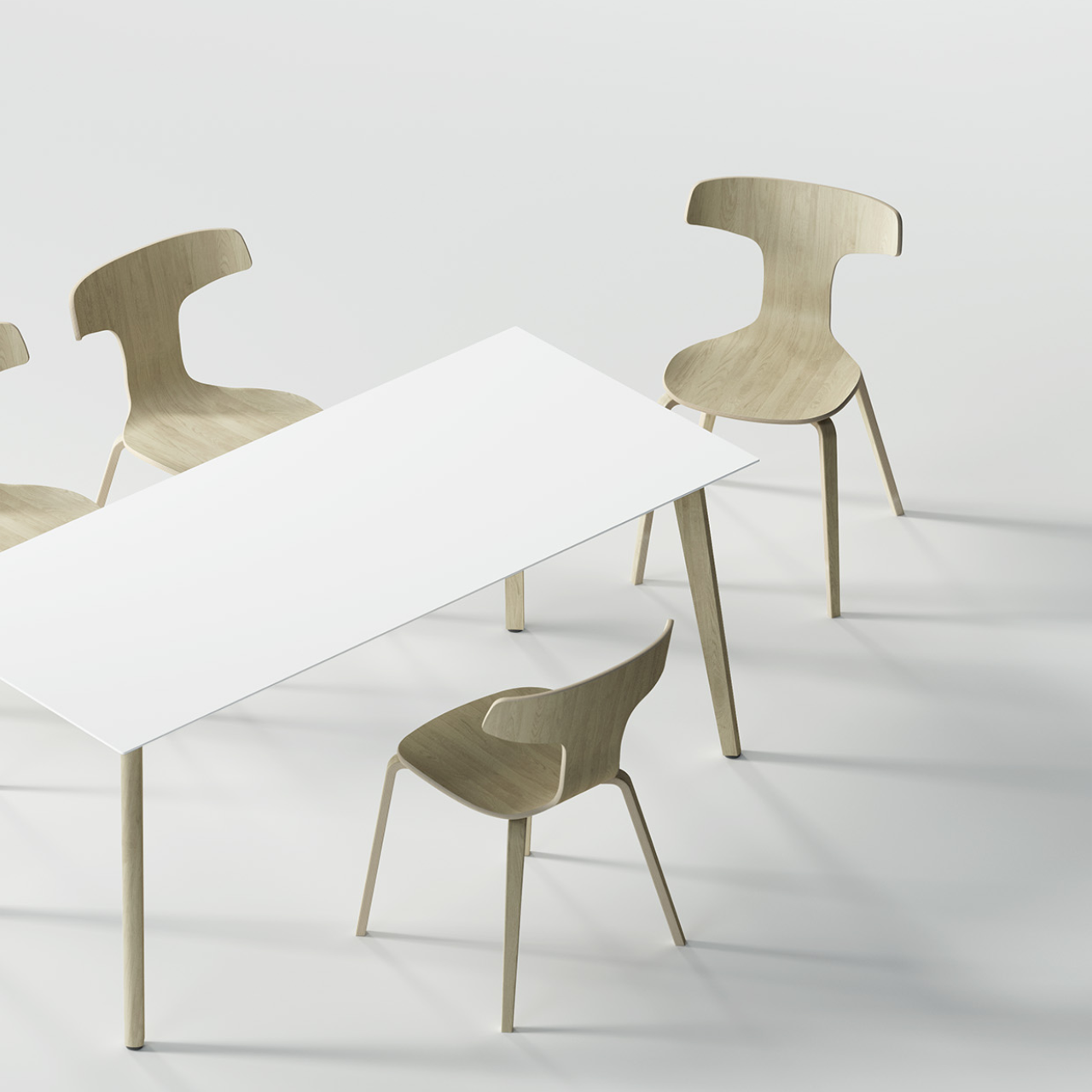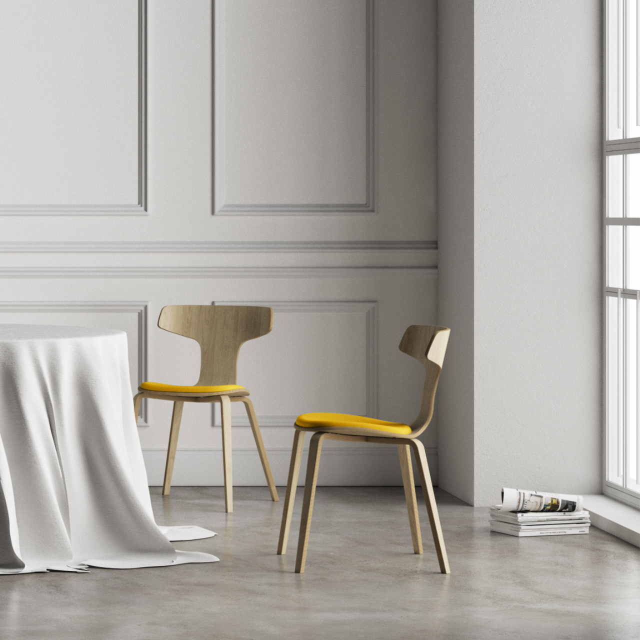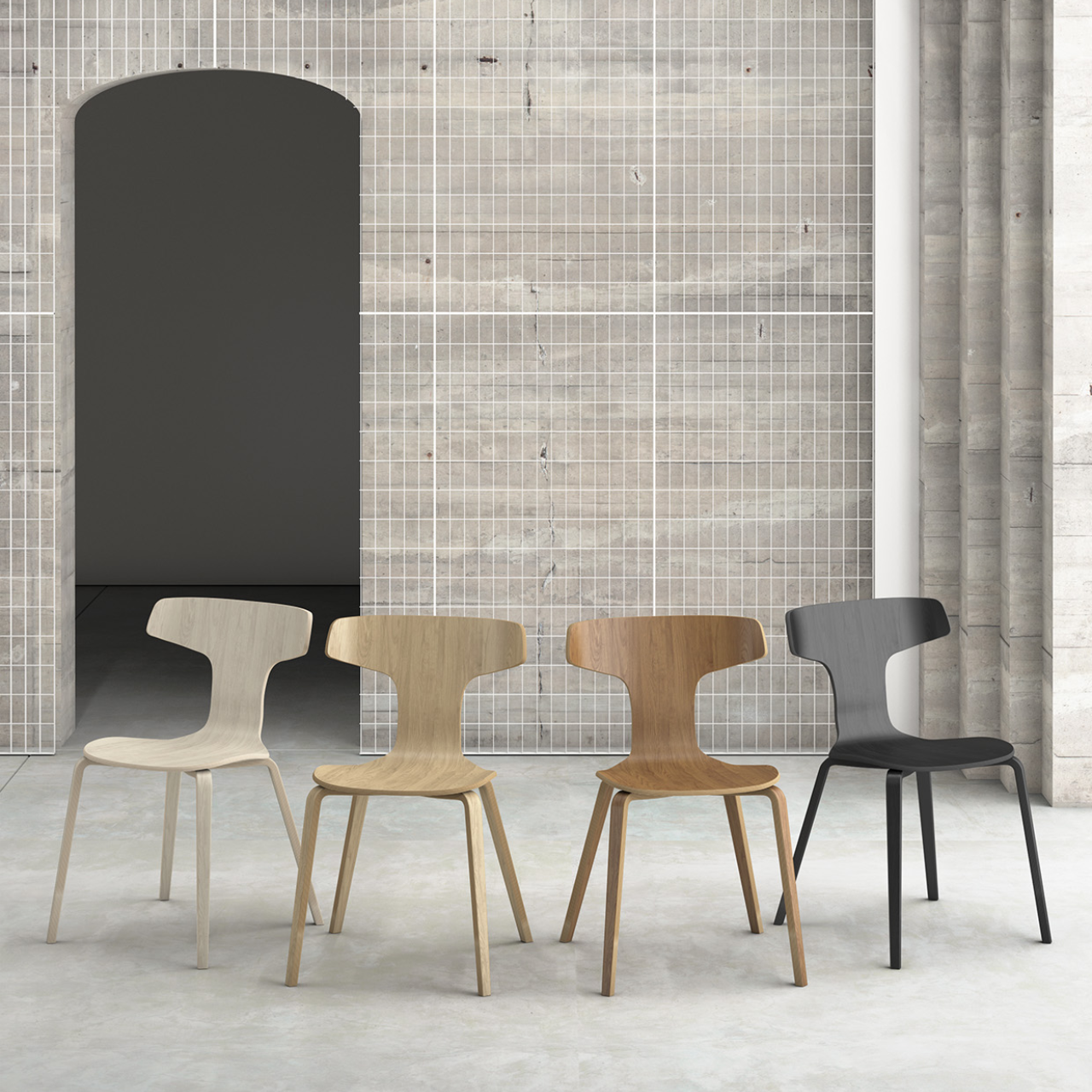 Całe krzesło jest wykonane z giętej sklejki. Wierzchnia warstwa sklejki to fornir jesionowy w 4 kolorach - dębu, bielonego dębu, orzecha oraz czarnym.